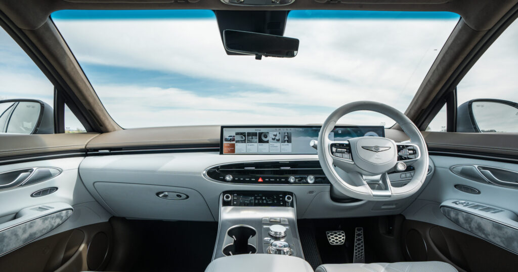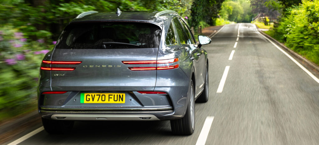 The Genesis GV70 is another step on the brand’s path to becoming fully electric by 2030 and the design is clean, with smooth lines and few fussy details. Its split LED lights are a Genesis signature and it retains the family grille up front as well.